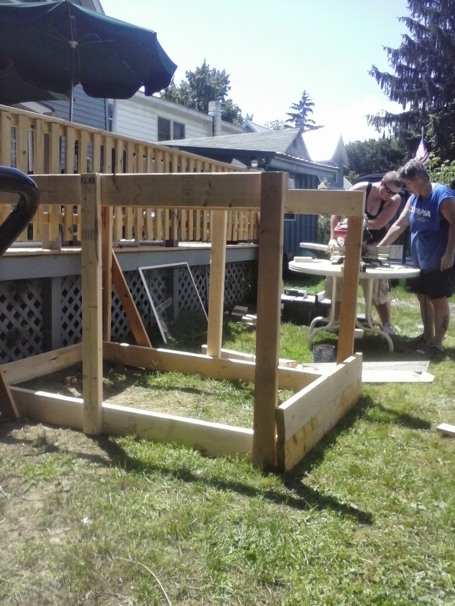 We still have to put a door on, roof it and stain it. But this is basically the final project before the cosmetics go on it. What do you think? Who do you think won this round of Bartering? I mean my mom got her lawn mowed, all of it (her backyard is on a huge hill) lunch, dinner (made by yours truly) pool drained and my company/helping hands, traded for this surprise building built…..