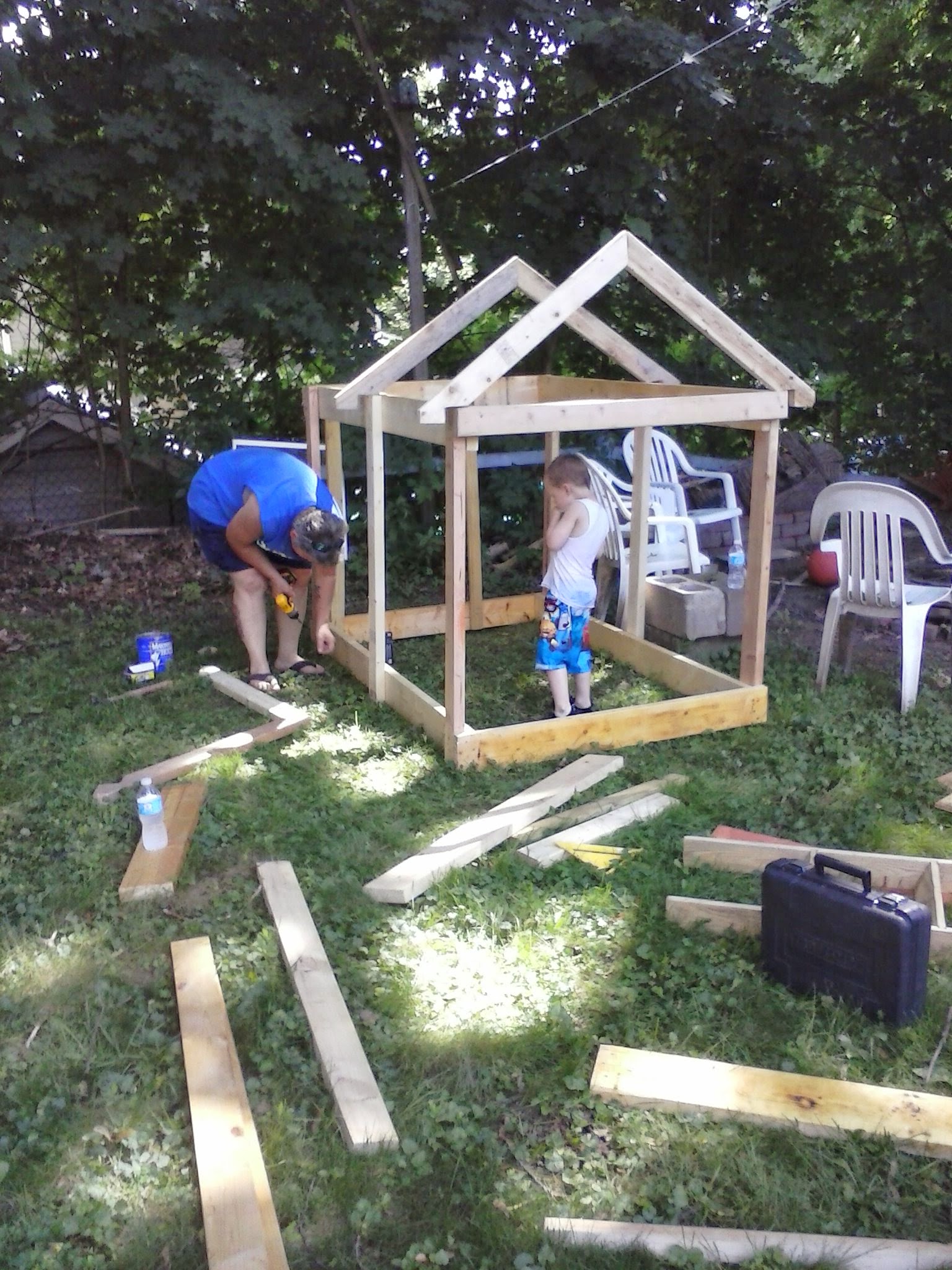 I think I got the better end of this deal but I agreed. I took off mowing her lawn while she gathered scrap wood and her tools. She drew a sketch and got to building. We talked, built, moved wood for hours as Mac played on his wooden play set. Finally, it was time to bring it to my house for construction.