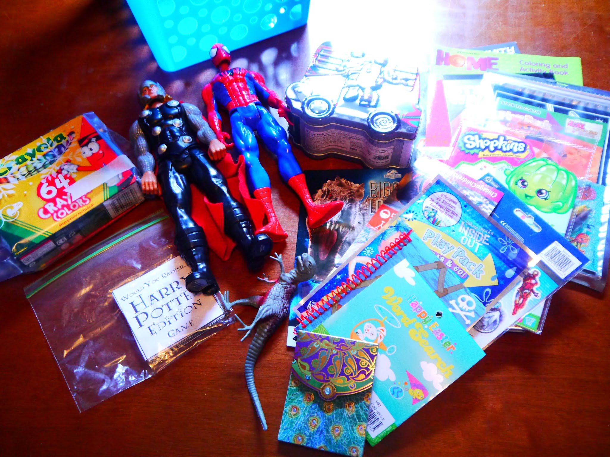 I have a son so this is what I pack in his GO-TO Travel bin. I grab a inexpensive bin (it is going to be joggled around in the car no need to splurge) from Dollar Tree. A few activities my son can do whilst we drive. Spelling words with Magnetized letters, games, crayons and coloring books!