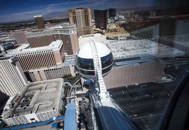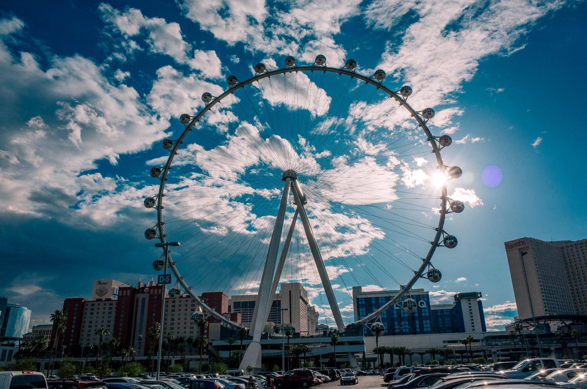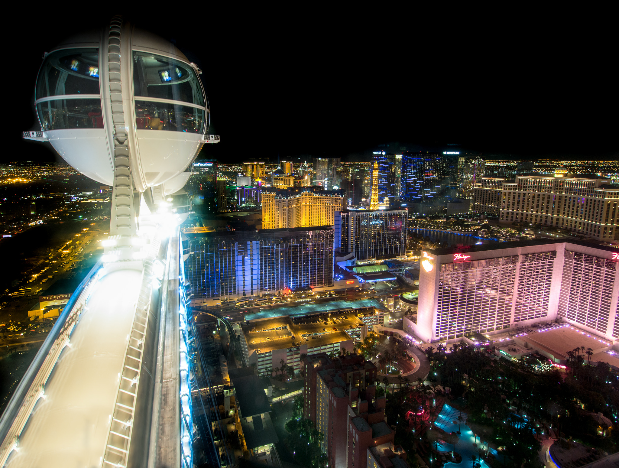 Facing north and south (parallel to Las Vegas Boulevard), the wheel takes 30 minutes to complete one full revolution and features 28 glass-enclosed cabins with broad views of the famed resort city.