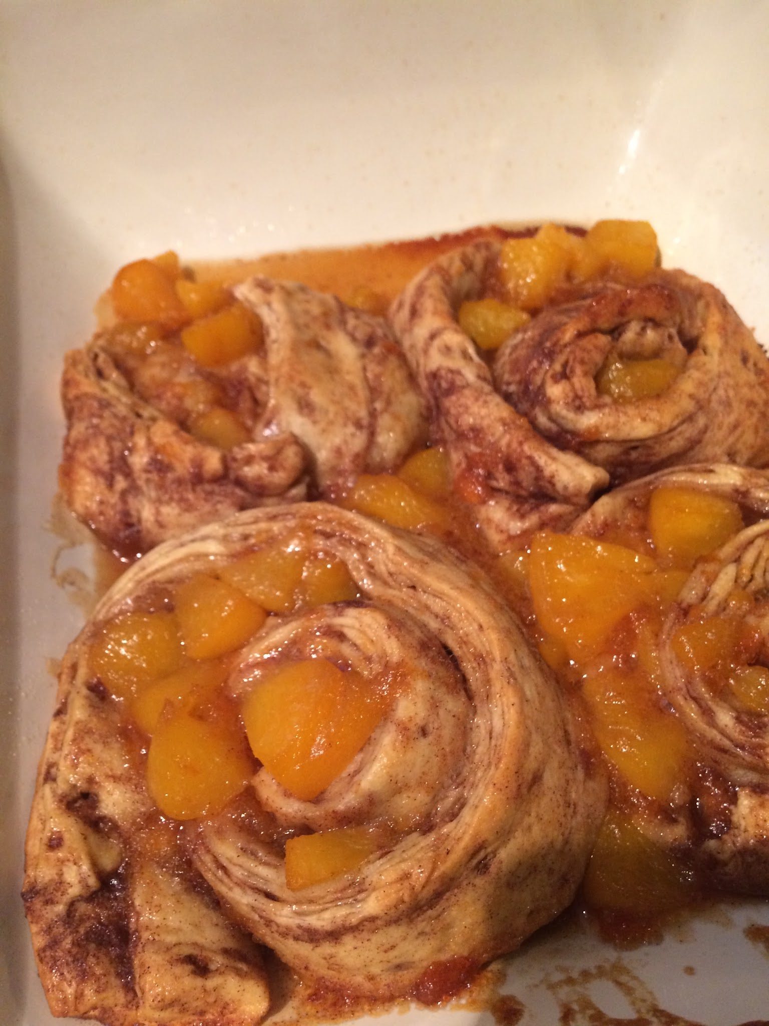 Melt butter and mix in brown sugar (You can use a microwave and save time). Add the jam and chopped peaches and canned diced peaches. Flatten out the cinnamon rolls on a cookie sheet and add mixture as shown above.