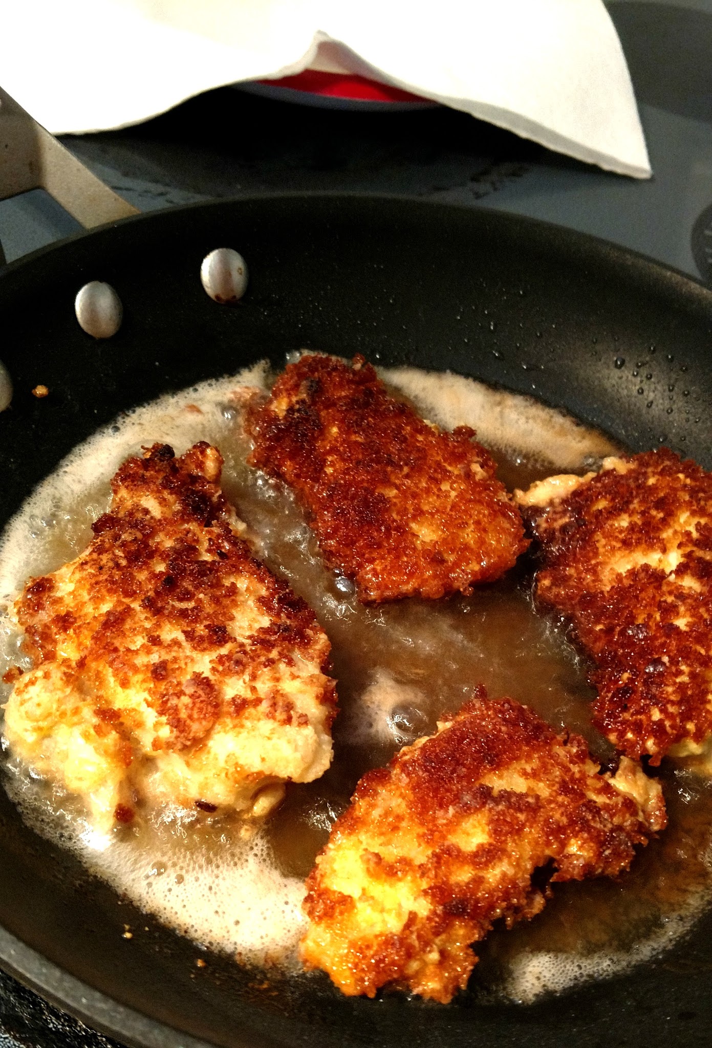 I added about half a cup of rice to my rice cooker and 1 cup water. I set it to cook brown rice and set it aside. I add some oil to a frying pan and turn on burner to MEDIUM. Then I got my ingredients ready to create the chicken portion of this recipe. I dunk chicken in the eggs, dunk in flour, dunk in breadcrumbs. I know some people re-dunk in the eggs but it never works and I end up with all my flour in the egg bowl. So, instead this is how I do it.