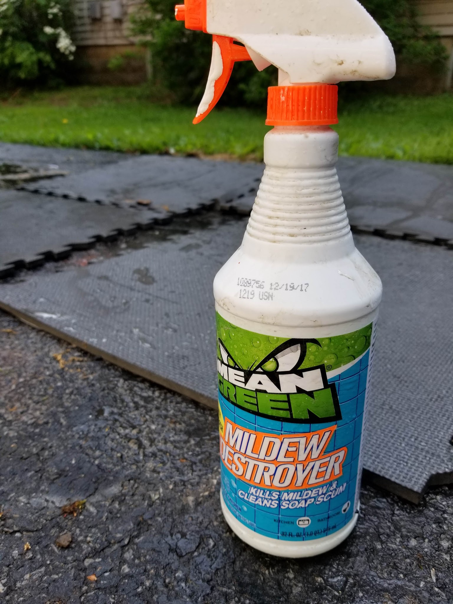 Since the walls are all sealed we needed to start working on the flooring. I had some exercise mats down there underneath my laundry machines. They were dirty and needed a good clean before I even considered using them again. Like I said in my first post, we had a lot of black mold in the basement. It spread all over and really I wish I had started this project many years prior! Because of this I have used a lot of the Mean Greens Mildew & Mold Cleaning spray!