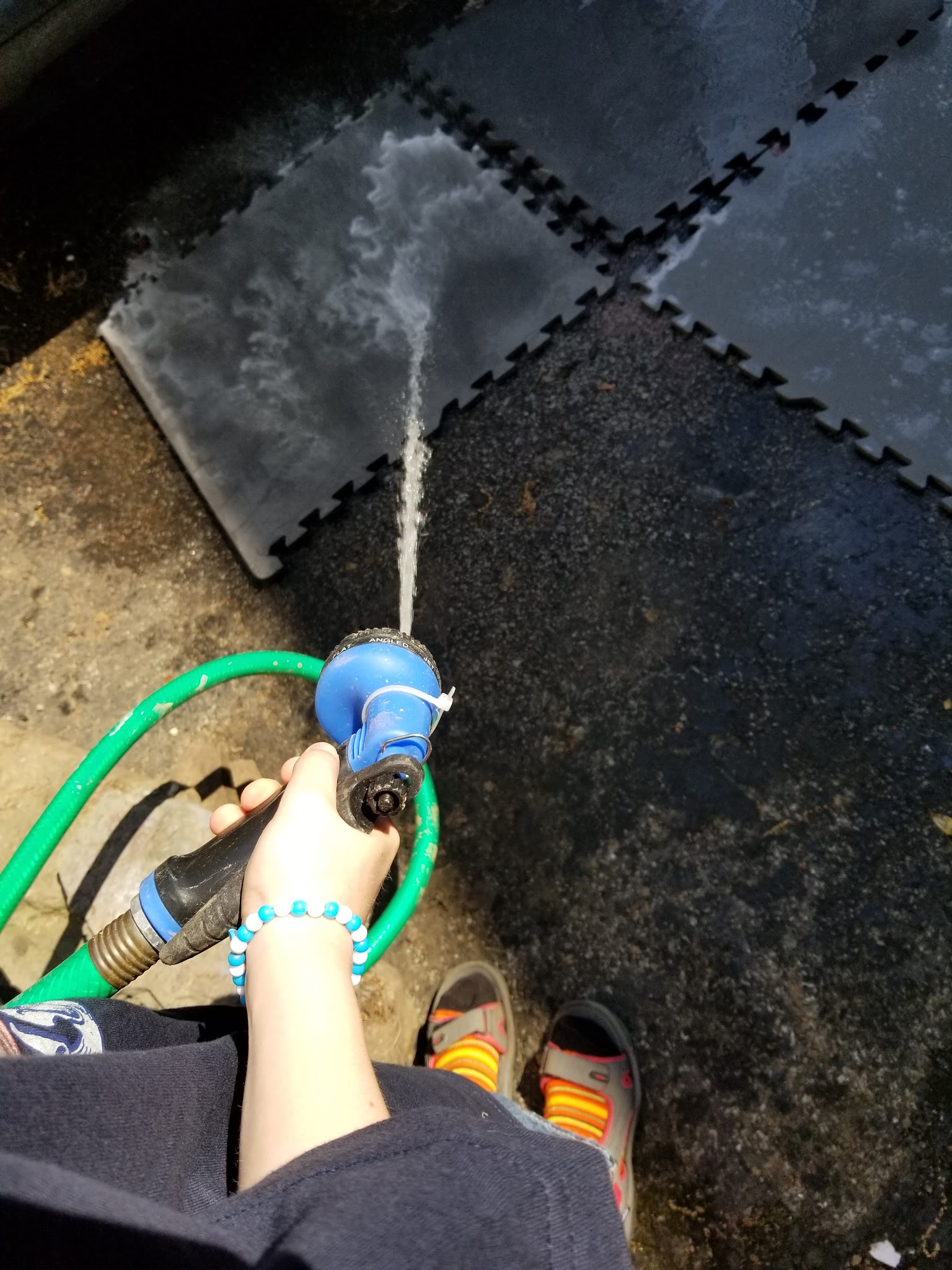 My son had fun with the hose that day for this. In the beginning we didn’t let him in the basement because of all the mold. Now that it has been all removed we give him little projects here and there. I still made him wear a mask because chemicals are chemicals!