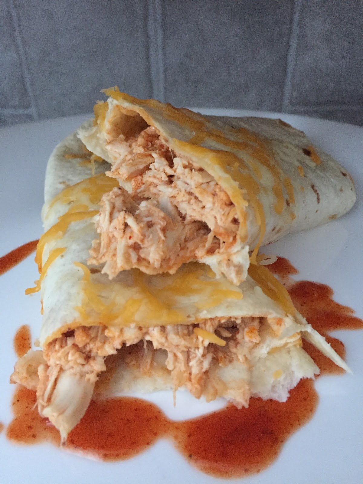 Pour the other can of Enchilada can in your oven pan. Once the chicken is cooked place in your tortilla wraps. Roll them up and place on the sauce. Sprinkle cheese on top and bake for 20-30 minutes at 365 degrees.