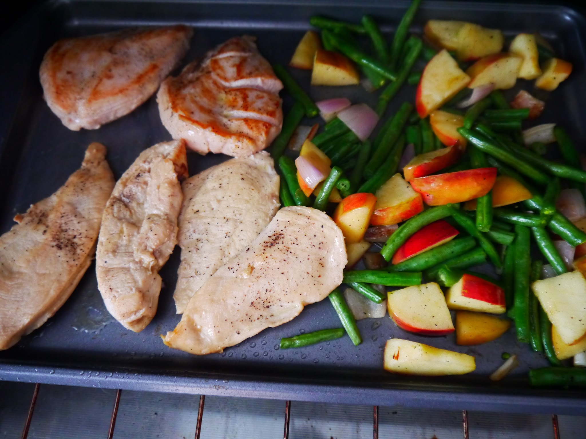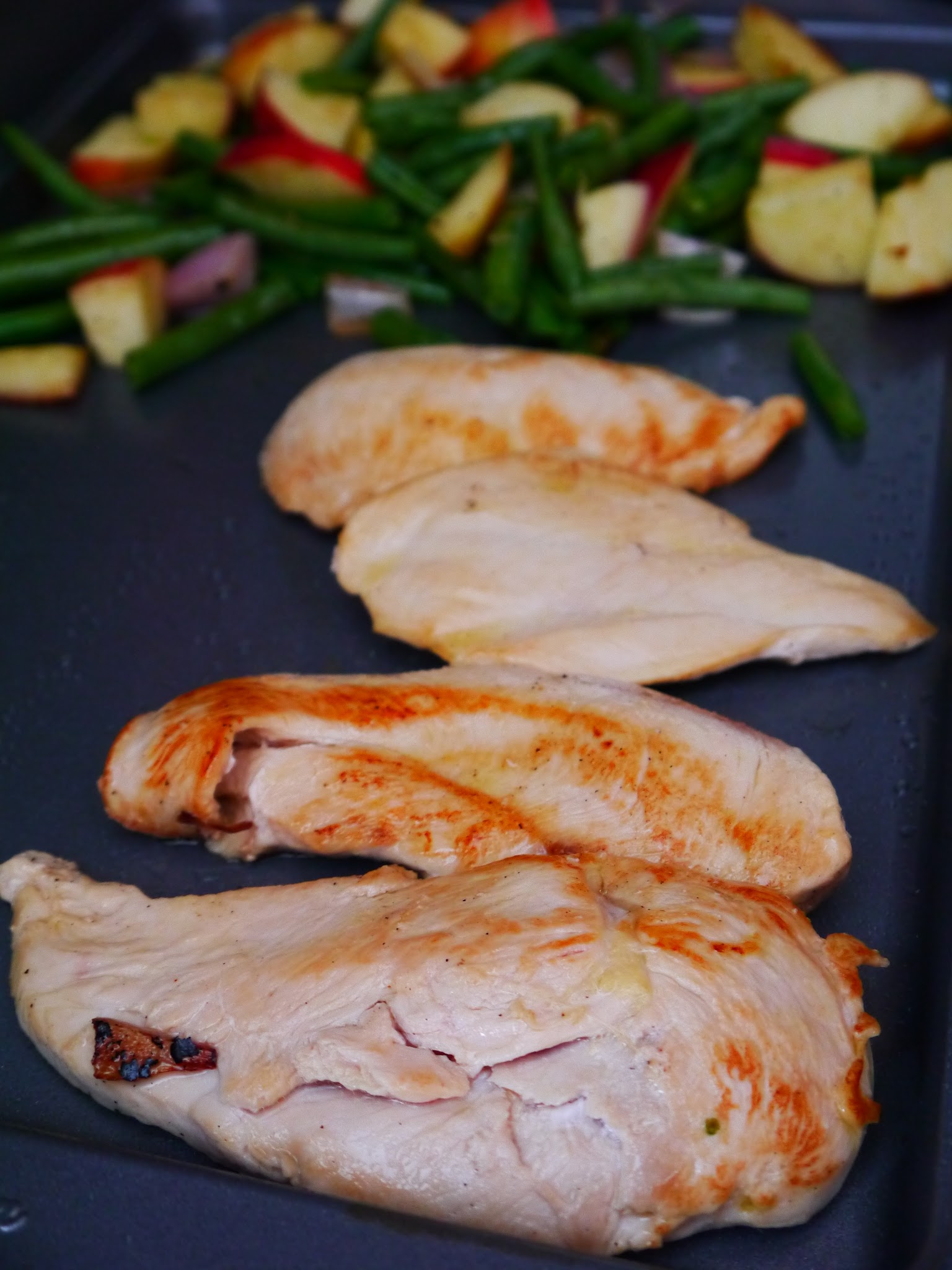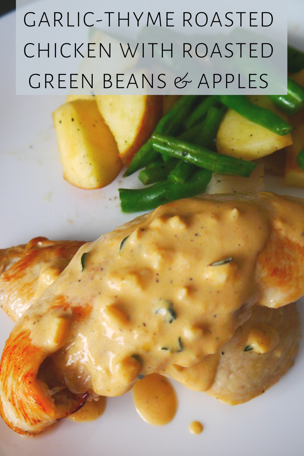 I have been really trying to open my horizons when it comes to our nightly dinners. I need some new dishes to try out and enjoy. I like creating new dishes and being challenged in my kitchen. This dish was inspired by a meal we had thanks to Home Chef, Garlic-Thyme Roasted Chicken with green beans and apples.