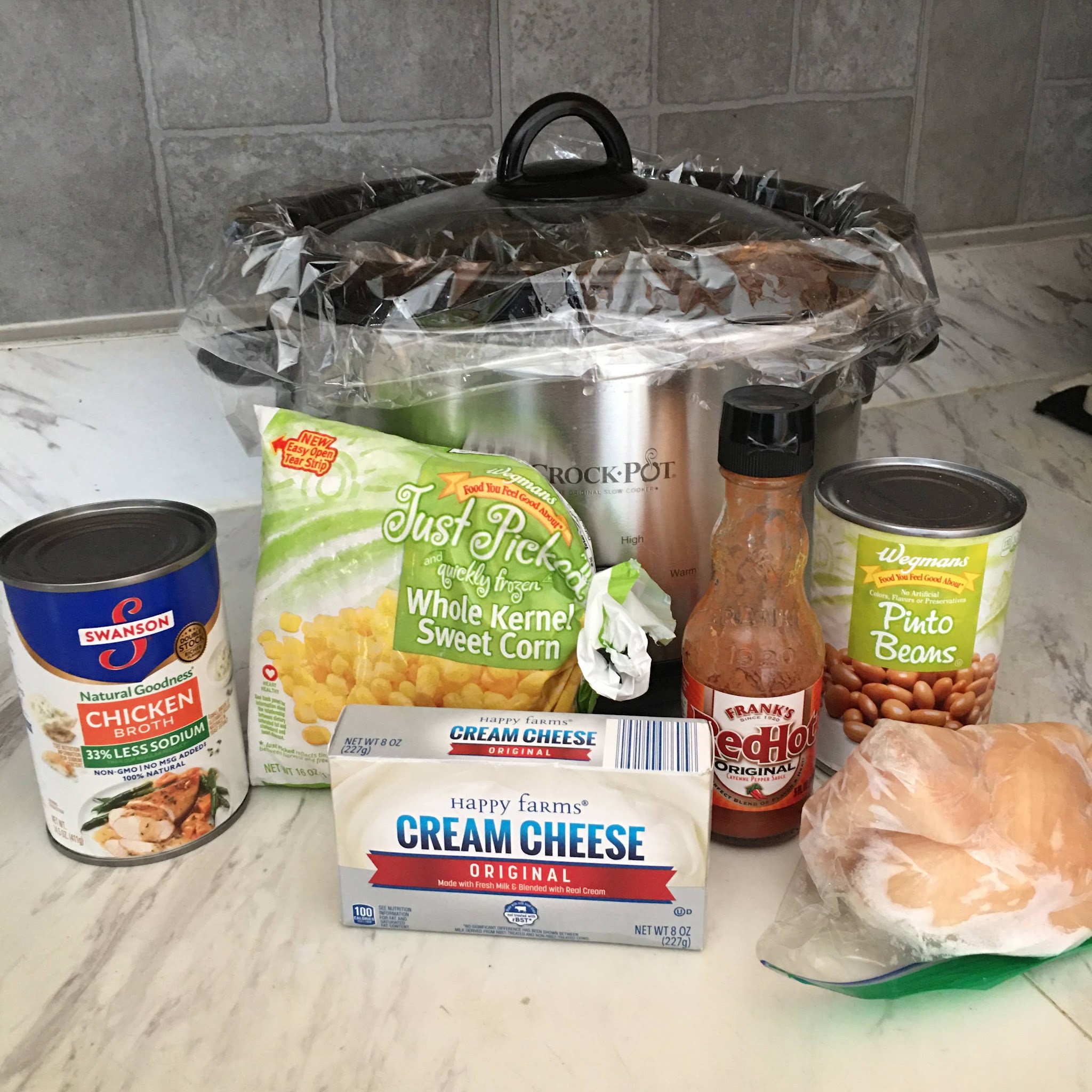 In a slow cooker ( I used a 5 quart round one) combine all the ingredients except the cream cheese and toppings. Set on low for 4-6 hours. If you use chicken that is already cooked you can change your cook time to about half.