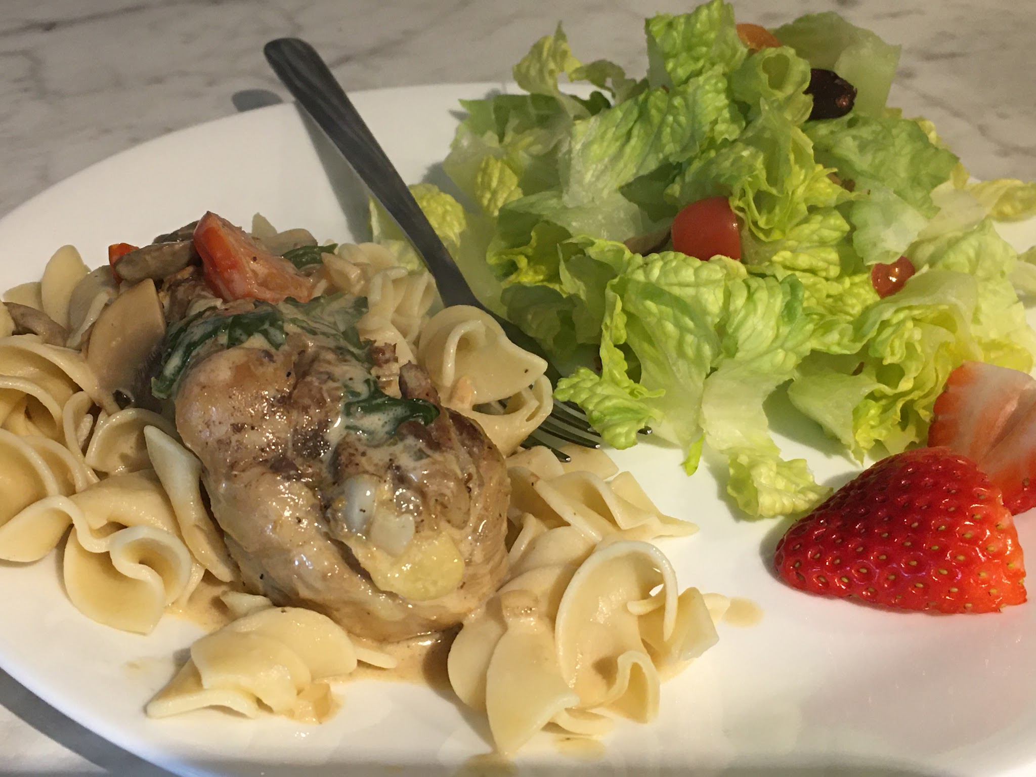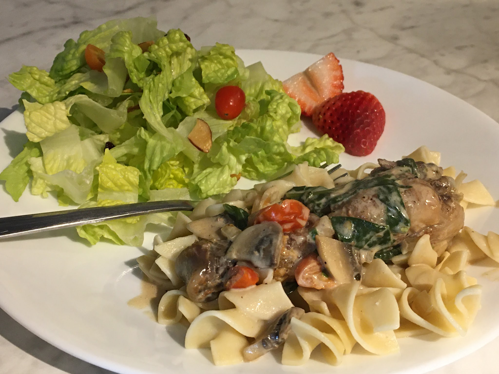 Once chicken is baked place in the skillet with the sauce. Meanwhile, cook noodles according to package directions. The sauce does not take long to thicken around 5-10 minutes tops. I add parmesan and spinach next, let them cook for another 5 minutes.