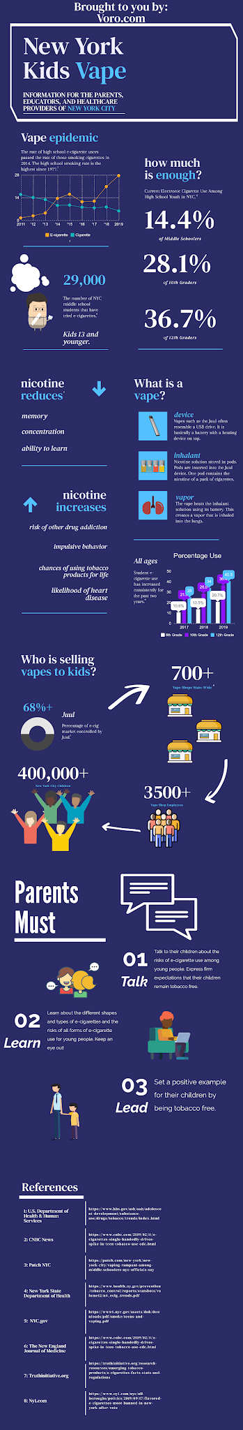 According to data from the 2018 New York State Youth Tobacco Survey (NYS‐YTS), over 27% of high school students report current use of electronic cigarettes (e‐cigarettes) and similar devices, a 160% increase from the 2014 prevalence of 10.4%. i don’t know about you but those stats are scary (excerpt here).